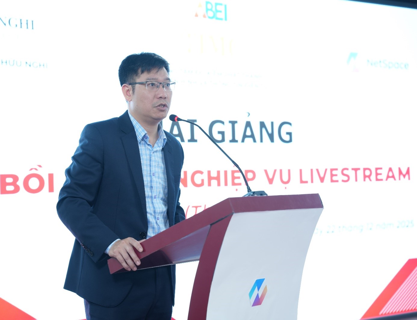 Ông Nguyễn Văn Tuấn Tổng Giám đốc Công ty Cổ phần Công nghệ truyền thông không gian số (NetSpace) phát biểu tại lễ Khai giảng. Ông Nguyễn Văn Tuấn, Tổng Giám đốc Công ty Cổ phần Công nghệ truyền thông không gian số (NetSpace) cho rằng, NetSpace vinh dự là đơn vị hợp tác với Trung tâm ĐKPTTH&TTĐT và trường Hữu Nghị tổ chức khóa học này. NetSpace là đơn vị đào tạo ra nhiều lớp KOL/KOC từ nhiều năm nay, và việc mở các lớp đào tạo, bồi dưỡng nghiệp vụ livestream này góp phần chuẩn hóa lĩnh vực livestream cho lực lượng KOL/KOC mà NetSpace đào tạo ra. Ông Tuấn cũng kỳ vọng, qua các khóa học này, Công ty NetSpace góp phần nhiều hơn nữa vào việc chuẩn hóa về livestream và nâng cao trách nhiệm xã hội với đội ngũ làm nội dung số và các KOL/KOC tham gia bán hàng online trên không gian mạng. Khóa hai lớp bồi dưỡng nghiệp vụ livestream diễn ra từ ngày 22-26/12/2025, với 5 chuyên đề: Tổng quan về livestream và nền tảng số- khái niệm, vai trò, xu hướng livestream; Quy định pháp luật và đạo đức nghề nghiệp, vấn đề pháp lý đối với Kol (người có tầm ảnh hưởng) Koc (người tiêu dùng có tầm ảnh hưởng) trên đa nền tảng; Nhận thức về nghĩa vụ thuế đối với tổ chức, cá nhân có hoạt động bán hàng online trên không gian mạng; Kỹ năng xây dựng nội dung livestream – lập kế hoạch kịch bản; Quản trị và phát triển livestream chuyên nghiệp và Thực hành kỹ thuật livestream- Trang thiết bị cơ bản (máy quay, micro, ánh sáng, phần mềm hỗ trợ). Một số hình ảnh trong lễ khai giảng: