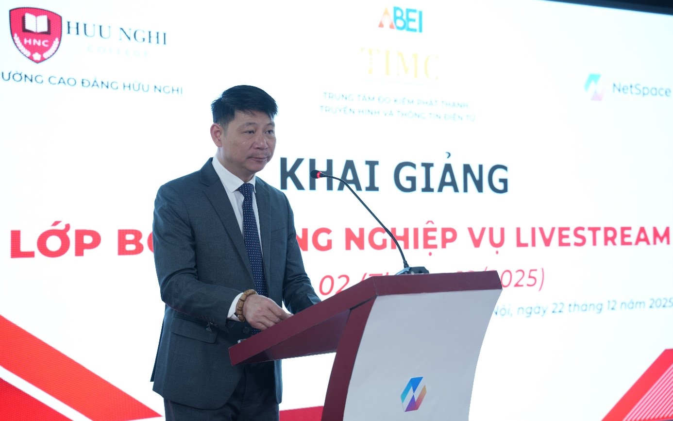 Phó Cục trưởng Cục phát thanh, Truyền hình và Thông tin điện tử Nguyễn Chấn phát biểu tại lễ khai giảng. Phát biểu tại lễ khai giảng, ông Nguyễn Chấn – Phó Cục trưởng Cục PTTH&TTĐT nhấn mạnh, Livestream từ một công cụ kết nối đơn giản đã phát triển thành một ngành kinh tế sáng tạo có sức ảnh hưởng sâu rộng tại Việt Nam. Trong bối cảnh công nghệ và truyền thông số phát triển nhanh chóng, việc bảo đảm tính chuyên nghiệp, chuẩn mực và định hướng đúng đắn cho hoạt động livestream là yêu cầu cần thiết. Với chức năng, nhiệm vụ được giao, Trung tâm đo kiểm phát thanh, truyền hình và Thông tin điện tử không chỉ thực hiện hỗ trợ cho công tác quản lý nhà nước về lĩnh vực đo kiểm chất lượng phát thanh, truyền hình mà còn được giao nhiệm vụ tổ chức, phối hợp liên kết bồi dưỡng nghiệp vụ, tuyên truyền, phổ biến pháp luật trong lĩnh vực phát thanh, truyền hình và thông tin điện tử. Đây cũng chính là thế mạnh và là nhiệm vụ trọng tâm mà Trung tâm đang nỗ lực triển khai. Cũng theo ông Nguyễn Chấn, làn sóng chuyển đổi số đang khiến hoạt động của KOL (Người có tầm ảnh hưởng), KOC (Người tiêu dùng có tầm ảnh hưởng) và livestream vượt ra khỏi phạm vi tương tác trực tuyến đơn thuần, trở thành phương thức truyền thông có sức ảnh hưởng mạnh mẽ đến thương mại điện tử, thương hiệu, giáo dục và giải trí. Tuy nhiên, sự phát triển nhanh cũng kéo theo những thách thức về chuẩn mực nội dung, đạo đức nghề nghiệp và tính minh bạch thông tin. Ông Nguyễn Chấn cho rằng, sự hợp tác tích cực giữa Trung tâm ĐKPTTH&TTĐT với trường Hữu Nghị và Công ty NetSpace chính là chìa khóa góp phần chuẩn hóa đối với lực lượng tham gia hoạt động livestream và người làm nội dung số.
